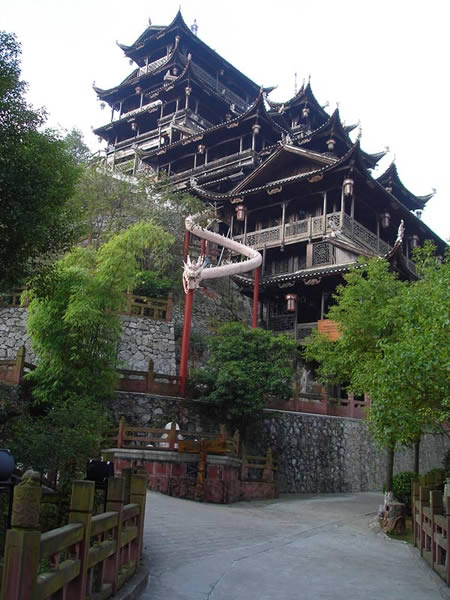 九重天世襲堂是土家風情園的精華和靈魂所在。該建筑由土家民間藝人李宏進設計,依80度陡坡而建,高48米,共9重12層,整個樓房全部用木栓連接,沒有一顆鐵釘,堪稱土家族建筑史上的奇跡。2002年9 月22日,九重天吊腳樓被載入世界吉尼斯世界紀錄,認定其為目前中國最大、最高、最完美的木質結構吊腳樓。2001年4月6日,朱镕基總理視察土家風情園時,對九重天贊不絕口:“一批民間匠人能造出這樣輝煌的吊腳樓,而且還解決了力學的問題,真是不簡單。”清華大學著名建筑學家何重義先生說:“張家界土家風情園完全可以和蘇州的園林相媲美。特別是九重天世襲堂,猶如玉宇瓊閣,令人神往!”古人說,天有九野,地有九州,土有九山,山有九寨。古人又把九重叫做天,說天有九重,最上一重是上帝和君主居住的地方,所以我們叫它“九重天”。