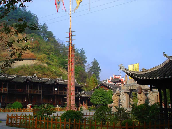 土司制度初建于五代十國時期,到了明朝己非常成熟了,土司王有無上的權威,在湘西有三大土司王分別是桑植土司向氏、永順土司王彭氏、慈利土司王張氏,其中又以永順溪州土司彭氏實力最強。其它土司王都為自己修建一座土司城,唯有彭氏分別在永定、永順修建了二座土司城。在永定的土司城內,彭氏為顯示其地位,修建了湘西最高的一座高達 48米,共12層的吊腳樓,整棟樓竟無一根鐵釘,堪稱土家吊腳樓建筑史上的奇跡,此樓于2002年9月被評為最高吊腳樓,榮獲世界吉尼斯之最,與此同時土司城內舉辦一千人參加表演的毛古斯舞蹈活動獲得圓滿成功,同時獲得世界吉尼斯之最。進入土司城,首先看到土司城迎賓儀式,土家漢子迎賓鼓,吹牛角、放沖,土家姑娘攔門歌,敬攔門酒,進入城內,在祭祀堂前舉行百人土家大祭祖活動,男女老少唱擺手歌、跳擺手舞,登世界最高的吊腳樓九重天,參觀土家族千百年來文化展示。到土家山寨,聽土家歌,賞土家族最有代表風俗哭嫁,三棒鼓,花燈等民俗表演。