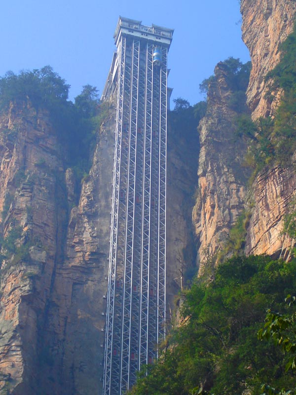 百龍?zhí)焯?BR>    百龍?zhí)焯荩怪备卟?35米,運(yùn)行高度326米,由154米山體內(nèi)堅(jiān)井和172米貼山鋼結(jié)構(gòu)井架等組成,采用三臺雙層全暴露觀光電梯并列分體運(yùn)行,每臺次載客50人次,運(yùn)行速度3米/秒,三臺同時(shí)運(yùn)行每小時(shí)往返量達(dá)4000人次。百龍?zhí)焯莸男藿▽?shí)現(xiàn)“山上游,山下住”的目標(biāo),提供了交通保障,將袁家界天下第一橋、迷魂臺、天懸白練以及烏龍寨、楊家界等絕世美景從幕后推向了前臺,并將天子山、袁家界、金鞭溪等精品旅游線路連為一體,解決了多年困擾景區(qū)的交通瓶頸問題。