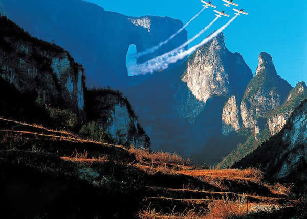 在張家界天門山國家森林公園的天門山主峰,有一個巨大的山洞,這就是舉世聞名的天門洞,1999年,俄國、美國、匈牙利、哈薩克斯坦、捷克、立陶宛六國飛行員架機穿越的山洞,創(chuàng)造世界吉尼斯紀錄的,就是在此洞。