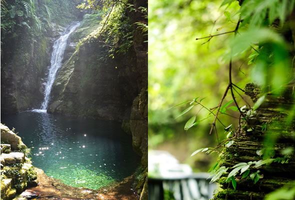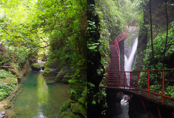 十八潭總名。稍作休憩,我們開始奔赴東線的景點(diǎn)。東線主要是以十八潭為主,下游有4潭:合潭、梳妝潭、魚潭、黑潭;中游有9潭:換衣潭、美人潭、石蛙潭、姊妹潭(3個(gè))、情侶潭(2個(gè))、二龍搶珠,上游有5潭:鬼谷神功(2個(gè))、幽潭、落銀潭(彩虹潭)、路邊潭。十八個(gè)潭深淺不一,淺則1米以上,深則4米左右,形狀各異,有的月牙形,有的豬腰狀,形狀不規(guī)則,石壁上水沖成潭,真是鬼谷神功,此處水質(zhì)細(xì)膩,加之綠林映襯,水色碧綠見底,猶如十八顆翡翠石鑲嵌在山林之間,涓涓溪流晶瑩剔透,飛流直下的瀑布,氣勢磅礴,蔚為壯觀, 下游的4潭,合潭、梳妝潭、魚潭、黑潭。合潭是仙女峽谷與十八潭的交匯處;梳妝潭的水清如明鏡,又因?yàn)樘秲蓚?cè)石頭的封閉,使這面鏡子靜止不動(dòng),很方便梳妝,照鏡子。在梳妝潭周圍,有一種植物屬于紅豆杉系列,它的形狀好似梳子,可以用來梳頭。魚潭可不能望文生義。魚潭,是在冬天的時(shí)候,所有的魚都聚集在這里過冬,除此之外,這個(gè)潭水淺見底,冬天魚苗聚集,是捕魚的好季節(jié)。黑潭,水深不見底,所以叫黑潭,F(xiàn)在已經(jīng)看不見梳妝潭、魚潭、黑潭了,你猜為什么?建水庫,建水上樂園,淹沒了。 斷魂石的傳說。三國時(shí)期,高氏和蕭氏一對夫妻春節(jié)忙活,遇上了天門垮眼,受余震襲擊,打死了丈夫蕭氏。高氏思念丈夫,淚哭不斷,結(jié)果摔死潭中。人們經(jīng)常還能聽到哭聲傳來,不敢單獨(dú)行走,需成群結(jié)隊(duì)。后人為了鎮(zhèn)邪,雕刻一條蜈蚣驅(qū)趕哭魂,多年后,蜈蚣成精,天上打雷,巖石發(fā)光,遭雷所劈,成了斷魂石。 和尚姥,也就是丹灶峰,天門十六峰之一。相傳此峰為仙人化身,赤松子曾在此煉丹,許多詩人在此留下了美妙的詩篇,明代葉守禮《丹灶峰》: 懸崖峭壁隔塵寰,上有仙人學(xué)煉丹。 煉得丹成鶴已去,獨(dú)留丹灶在峰巒。 意思是說,在這險(xiǎn)峻秀麗的山峰上,赤松子潛心煉丹,不受塵世干擾,身心沉醉于秀美的山間,沉溺于丹藥的煉制之中。作者很是羨慕那種與世隔絕的超脫,那種執(zhí)著于自我理想的瀟灑,你羨慕不羨慕? 竹林叢生。我們要學(xué)習(xí)竹子的精神,中空、謙卑;我們要學(xué)習(xí)竹子的精神,抱團(tuán)生長;我們要學(xué)習(xí)竹子的精神,破土而出,節(jié)節(jié)高。 向家塔。打造農(nóng)耕養(yǎng)生游的地方。種田、種菜、種花,農(nóng)家餐館。 爛泥巴根。爛泥巴根和馬桑樹是同科,是這里獨(dú)特的一種樹。馬桑樹亦稱“千年紅”、“馬鞍子”,屬落葉灌木,馬桑樹多枝叢生,一簇一簇的,枝葉像傘蓋,因此“馬桑樹兒搭燈臺(tái)”。春風(fēng)一吹,滿山的馬桑樹、爛泥巴根就吐翠滴綠,顯示出強(qiáng)勁的生命力。打油詩一首: 青青枝條四方走, 肥肥大葉落上頭, 身在路邊無人問, 冬去春來樂悠悠。 秋天死亡,春天長勢更加茂盛,它的新生是通過死亡實(shí)現(xiàn)的。山川如此,植物也是如此,這里的一草一木無不透露著道家那種齊生死、等貴賤的精神。 這叫“常道”亭,“道可道,非常道”,據(jù)說是白狐與劉海相遇的地方。吊橋。 十八潭各具特色。 中游有9潭。第五潭叫換衣潭。巖石聳立,霧氣氤氳,巖壁上布滿水汽,猶如雨下。又因過道狹窄,行人需彎腰通過,未免雨水打濕衣裳,在此就要脫下身上衣物,通過后在第六潭再穿上。因此第六潭又叫美人潭,很幽深神秘的。第七潭叫石蛙潭,水淺,又比較平穩(wěn)、安全,春天產(chǎn)籽。余音回響,猶如蛙鳴,給人“聽取蛙聲一片”的錯(cuò)覺。 對面巖壁叫“臘肉鋪”,那條自上而下的溪流叫“酒長流”,客人來了,咱土家人熱情,臘肉下炕,苞谷燒,喝兩口! 第八潭第九潭叫情侶潭,比較隱蔽,他倆靜悄悄地談著情話,我們快走,不要打攪他們。 第十潭、十一潭、十二潭叫姊妹潭。下面那個(gè),水淺淺的,溫溫的,是幺妹潭,中間那個(gè)是二哥潭,上面那個(gè)是大哥潭。 潭的旁邊有珍稀植物馬蘭花,馬蘭花又名蝴蝶花、蝴蝶蘭,為多年生宿根草本花卉,根莖短粗,肥壯;ù笮缕妫ㄉk麗,鮮艷奪目。花有藍(lán)、白、黃、雪青等色;ㄆ5-6個(gè)月,每次花可開花7-10天,頗耐觀賞。馬蘭花在我國栽培已有2000多年的歷史,目前歐、亞、非3洲均有分布,品種極多,難以計(jì)數(shù)。此花按植株高度不同可分3種類型:矮株型僅18-25厘米,中株型高25-70厘米,高株型可高達(dá)120厘米。馬蘭花喜陽光,適栽于背風(fēng)向砂質(zhì)土壤中。 馬蘭開花的童謠。他們?nèi)⒚眯r(shí)候情感深厚,常常一起跳皮筋。大家會(huì)跳嗎?會(huì)唱嗎? 小汽車,滴滴滴,馬蘭開花二十一, 二五六二五七,二八二九三十一, 三五六三五七,三八三九四十一, 四五六四五七,四八四九五十一, 五五六五五七,五八五九六十一 。…… 還有紅豆杉,像梳頭的篦子,叫“篦子三尖杉”。還有蘭心草,中草藥,空中飄來蘭花的香氣,山谷中峭壁的蘭花,如芳芳人品善良高雅。蘭花如人品有宜人的香氣,蘭花有撩人的幽香,任何花卉的香氣都不能與蘭花比。這幽香時(shí)隱時(shí)現(xiàn),時(shí)濃時(shí)淡,時(shí)遠(yuǎn)時(shí)近。飄蕩在老道灣山谷中,給人清新和愉快的感受。 蘇轍有詩:“谷深不見蘭生處,追逐微風(fēng)偶得之”。 還有大葉榕、玉葉金花、秋海棠、臘蓮繡球、四字馬蘭、紅楓,秋天來臨,看!漫山紅遍,層林盡染。 聞道亭。孔子曰:朝聞道,夕死可以。意