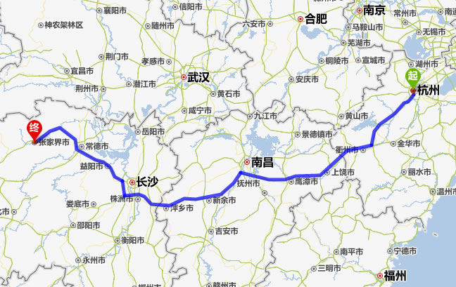 左右,沿途經過杭州——桐廬縣——建德市——衢州市——上饒市——鷹潭市——新余市——宜春市——萍鄉(xiāng)市——株洲市——湘潭市——寧鄉(xiāng)縣——益陽市——常德市——慈利縣——張家界。
