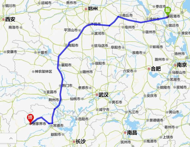 左右,沿途經過新沂——徐州——商丘——許昌——平頂山——南陽——襄陽——荊門——荊州——常德(也可以走國道經澧縣、石門縣)——慈利——張家界。