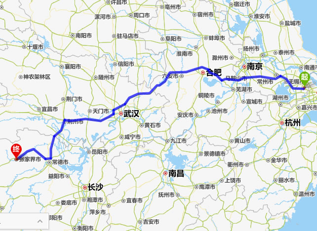 左右,沿途經過昆山——無錫市——馬鞍山市——合肥——六安市——麻城市——仙桃市——潛江市——荊州市——常德市(這里可以不走常德,直接從荊州經澧縣、石門縣到慈利縣)——慈利縣——張家界。