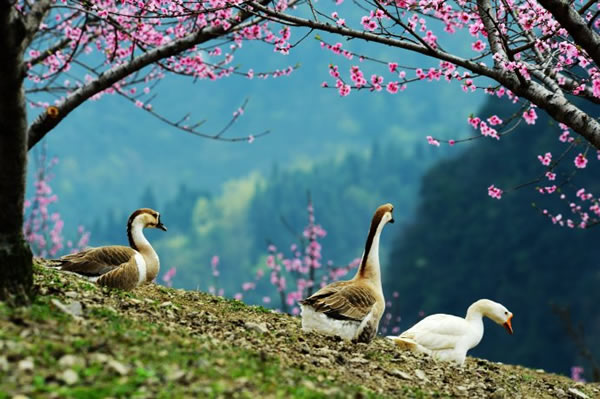 桃之夭夭,灼灼其華。據(jù)了解,天子山這處桃花仙境位于神堂灣至大觀臺之間的一農(nóng)場山丘內(nèi),面積足有一百畝以上。由于該地段剛好處于天子山至高點,因此極目遠眺,峰林風(fēng)光、桃花美景盡收眼底。而盡管農(nóng)場,則是一派鄉(xiāng)村田園風(fēng)情,一群雞鴨鵝不時穿梭在桃樹林內(nèi),一邊尋覓食物,一邊享受春光;看家護院的小黃狗迎接游客的熱情叫聲,讓人頓生回歸鄉(xiāng)愁之感。