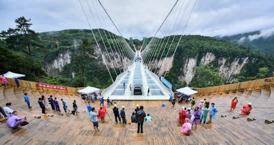 張家界大峽谷玻璃橋位于湖南省的張家界大峽谷景區(qū)栗樹埡和吳王坡區(qū)域內(nèi),為一座景觀橋梁,兼具景區(qū)行人通行、游覽、蹦極、溜索、T臺(tái)等功能。主跨430米,一跨過(guò)峽谷,橋面長(zhǎng)375米,寬6米,橋面距谷底相對(duì)高度約300米。這座全透明玻璃橋長(zhǎng)度、高度位居世界第一玻璃橋建成后,將成為世界首座斜拉式高山峽谷玻璃橋;并創(chuàng)下世界最高最長(zhǎng)玻璃橋、首次使用新型復(fù)合材料建造橋梁等多項(xiàng)世界之最。
